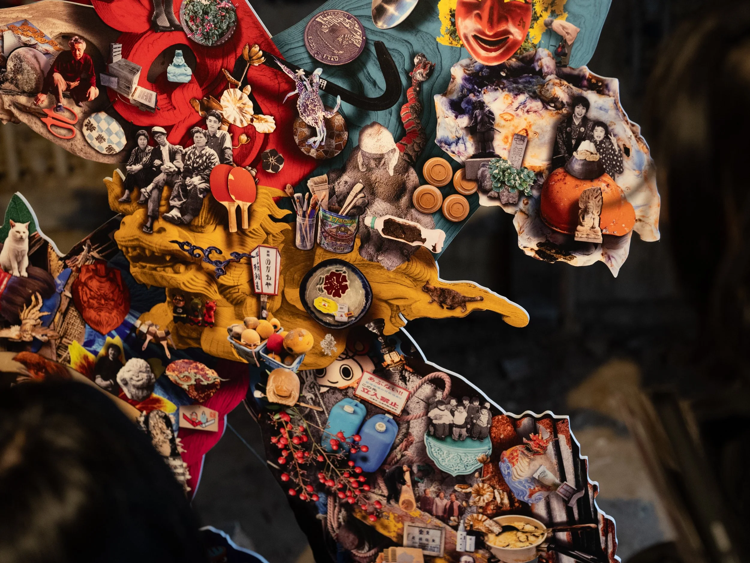 Anne and Luke developed a new chapter of their ongoing project News From Home – Yunotsu, consisting of three large-scale free-standing photomontages (150 × 100 cm) created from over 3,000 photographs and hours of video footage. Through photomontage, the artists reconstructed these materials into dense, layered compositions in which fragments coexist within each frame.