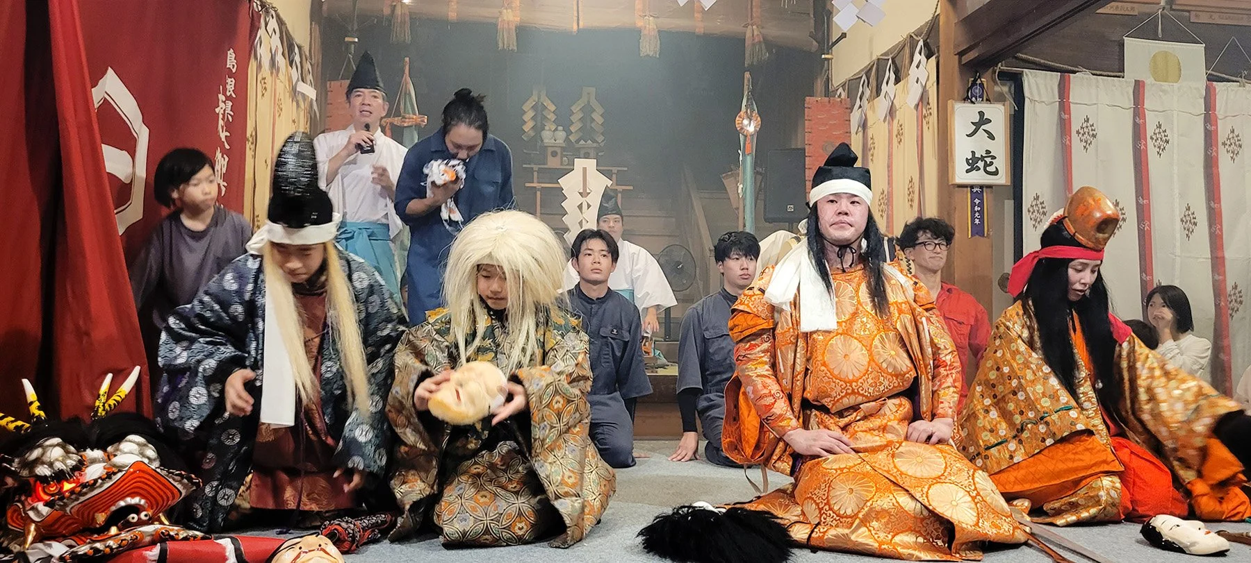 She had the opportunity to closely observe Iwami Kagura performances, translating the rhythm, movement, and expressive gestures of ritual into visual forms. Visits to washi workshops and mask-making ateliers deepened her understanding of traditional techniques, revealing how paper, masks, and ritual performance intertwine to convey identity, symbolism, and movement.